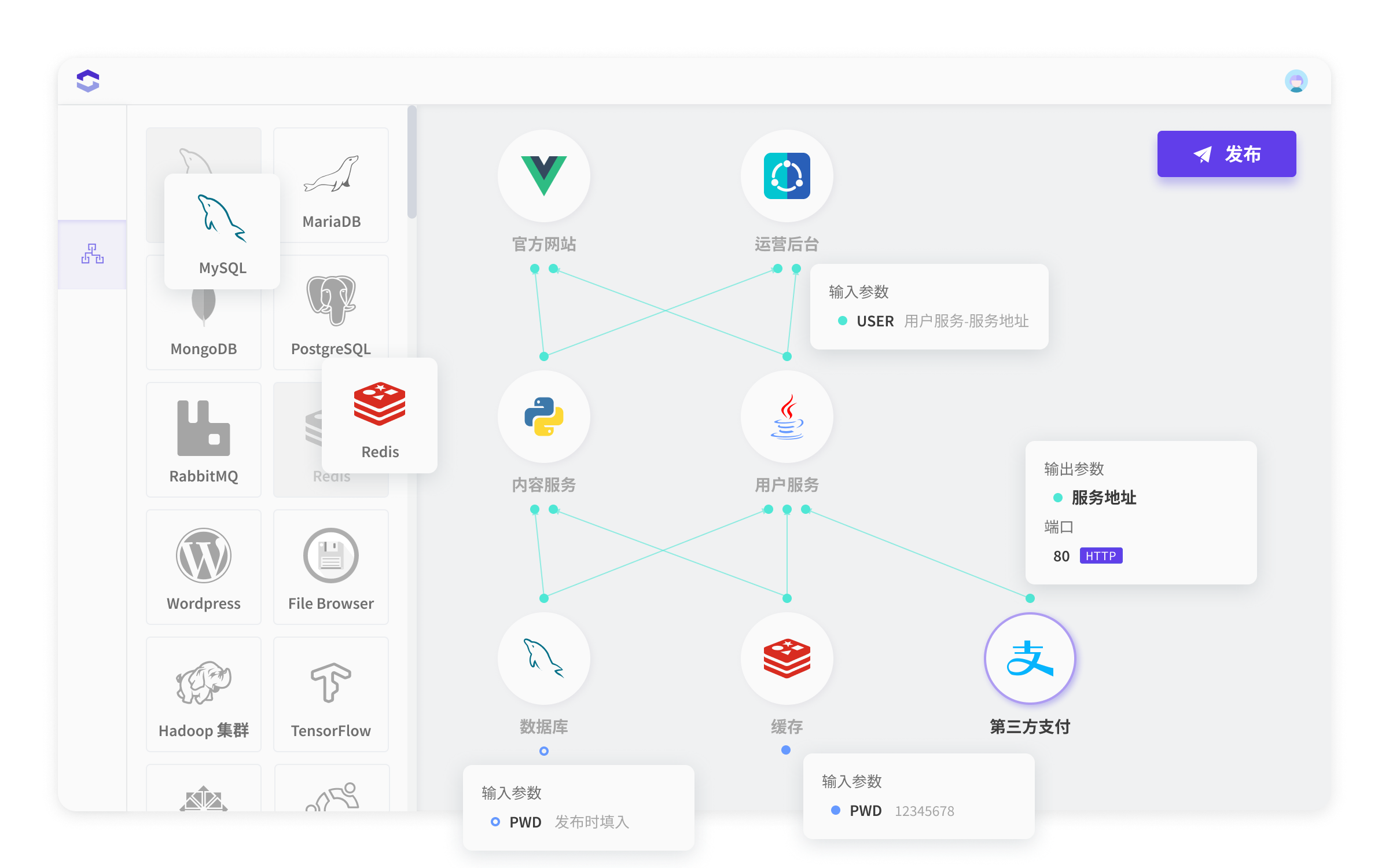 不同与传统意义的架构图,这张图本身是可交付的。开发者可以在任意时间,对这张架构图进行发布,来部署一套完整的应用。