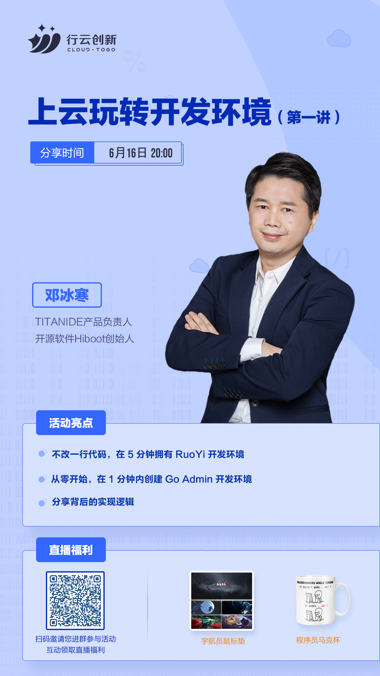 6月16日20:00,“上云玩转开发环境”第一讲即将开启!ok138cn太阳集团创新 TitanIDE 产品负责人邓冰寒将分享:如何利用 TitanIDE 在不改一行代码情况下,在5分钟拥有 RuoYi 开发环境;如何从零开始,在1分钟内创建 Go Admin 开发环境;以及分享这背后的实现逻辑。直播间还会送出宇航员鼠标垫、程序员马克杯等福利,快扫码参与活动吧~